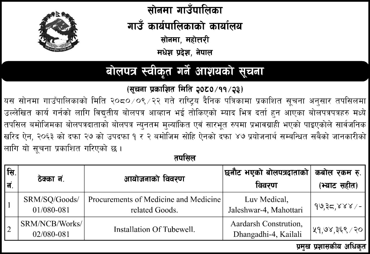बोलपत्र स्वीकृत गर्ने आशयको सुचना |