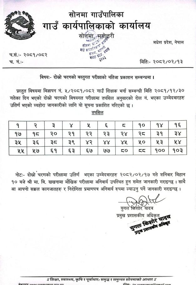पाेषणकाे लिखत परिक्षाकाे नतिजा प्रकाशन