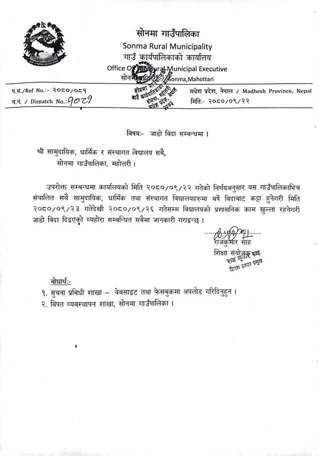 जाडो विदा दिइएको व्यहोरा