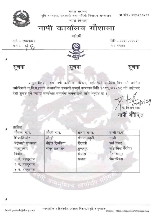 नापी कार्यालय गौशाला महोत्तरीको सुचना l