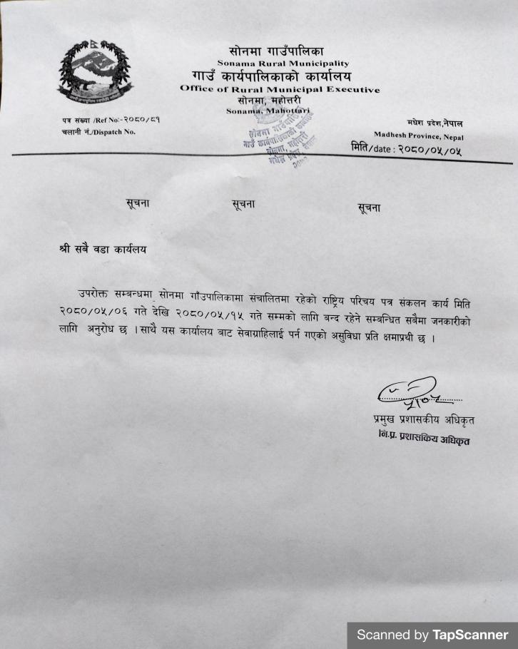 परिचय पत्र संकलन कार्य बन्द रहने सम्बन्धमा
