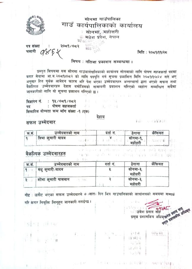 पाेषणकाे लिखत परिक्षाकाे नतिजा प्रकाशन