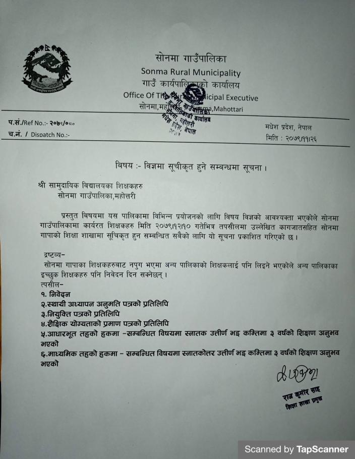 सूचना प्रसाशन गरिएको सम्बन्धमा |