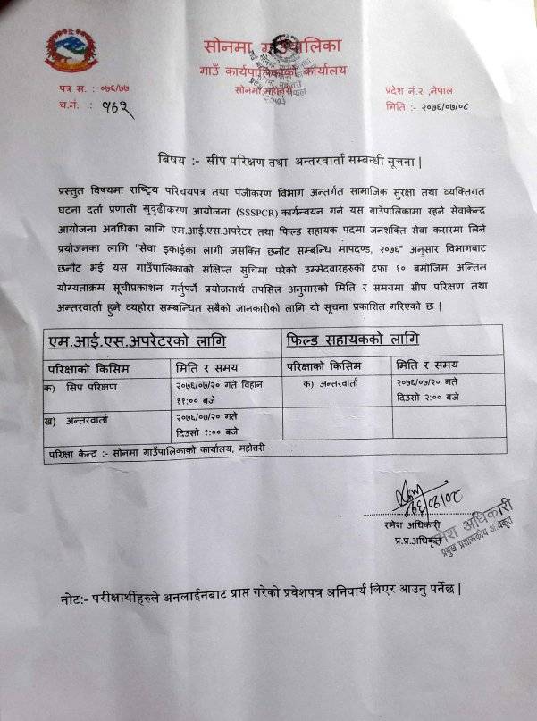 सीप परिक्षण तथा अन्तरवार्ता सम्बन्धि सुचना